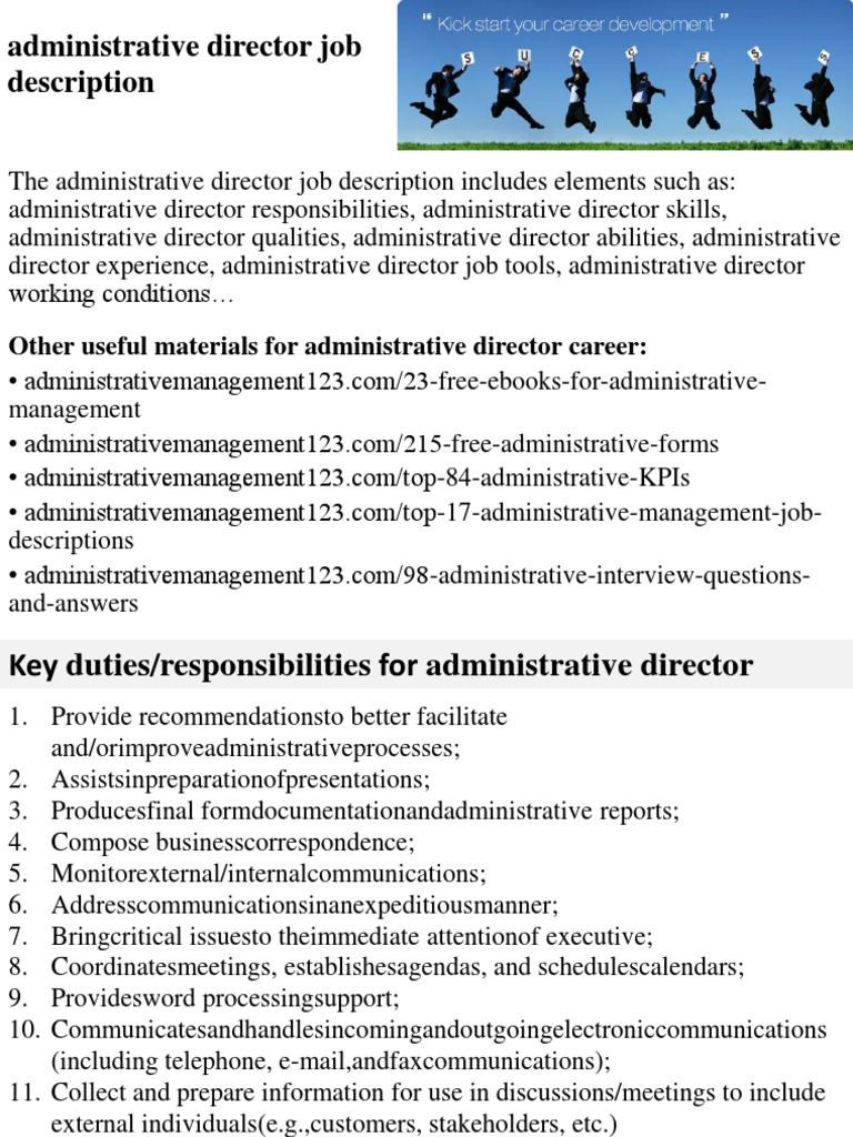 Job description the specific role and responsibilities of an emergency department (ed) medical director vary based on the size, characteristics, and leadership structure of the department. Typical job duties • liaising with clients, producers and other staff Currently in need of a part time personal assistant to help will various types of administrative and logistical tasks related to a small private medical practice. Personal assistant to the director job description summary of job provide full administrative and secretarial support at a senior level to the director to ensure the smooth management of her day to day affairs, and most effective use of her time. Medical directors oversee the operation and success of medical services, hospital departments, clinical training services and blood banks.